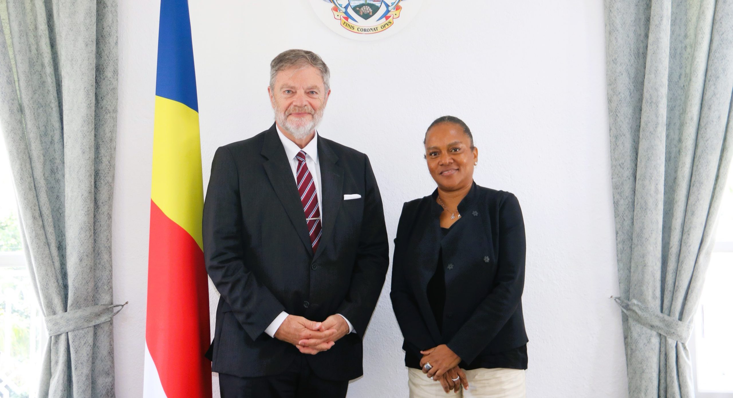Acting Principal Secretary, Ambassador Beryl Samson, met H.E. Ambassador Wolfgang Hermann Dodd on his official visit to Seychelles, as Special Envoy to Campaign for a Non–Permanent seat on the United Nations Security Council, for the term 2027 – 2028, at Maison Quéau de Quinssy on 15 April 2026. He was accompanied by Germany’s Ambassador to Seychelles, H.E. Mr. Sebastien Groth.